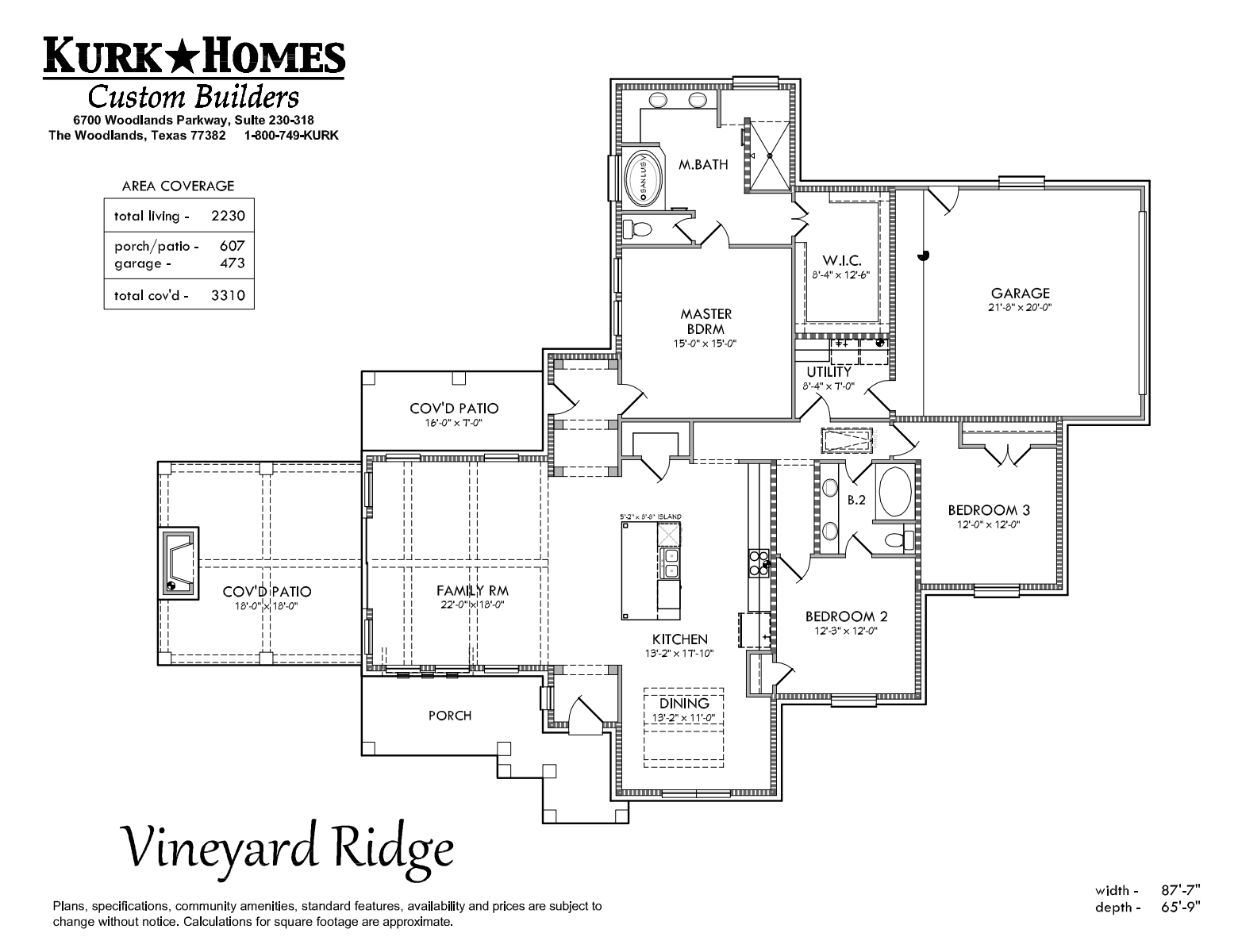 The Vineyard Ridge home plan is custom-designed with an appreciation for the property on the front, side, and rear of the home. The family room vault and ceiling beams continue the view to the covered patio, and the exterior fireplace serves as the focal point through the sliding glass doors and windows of the family room. Also featuring an oversized eat-in island, the kitchen is open to the family room with three walls of windows and includes a dedicated dining space in the front of the home. The master suite has a walk-in shower and soaker bathtub, an oversized walk-in closet, and is separated from the spare two bedrooms by opposite hallway entrances just off of the kitchen. Entry into the home from the 2-car attached sideload garage is through the open utility room, which also functions as a mudroom with a built-in “drop zone.”